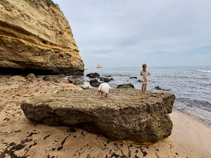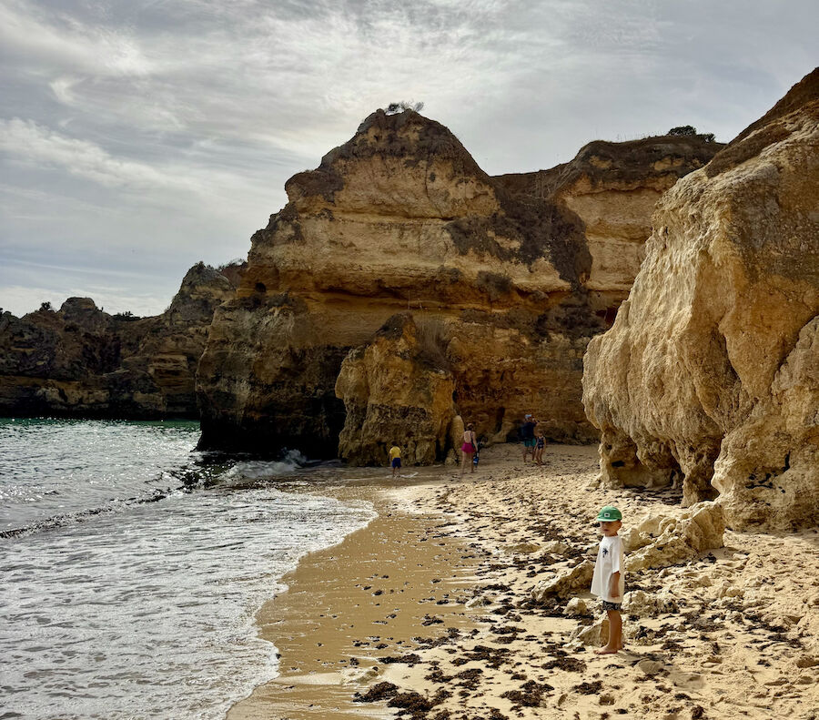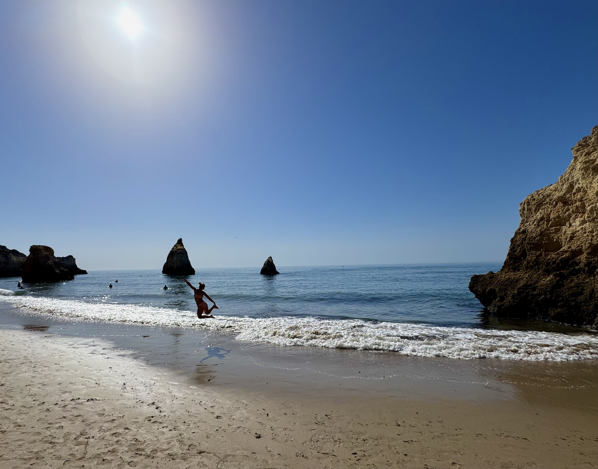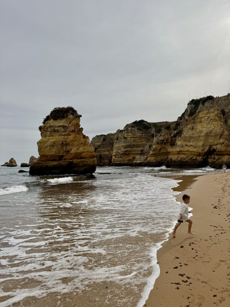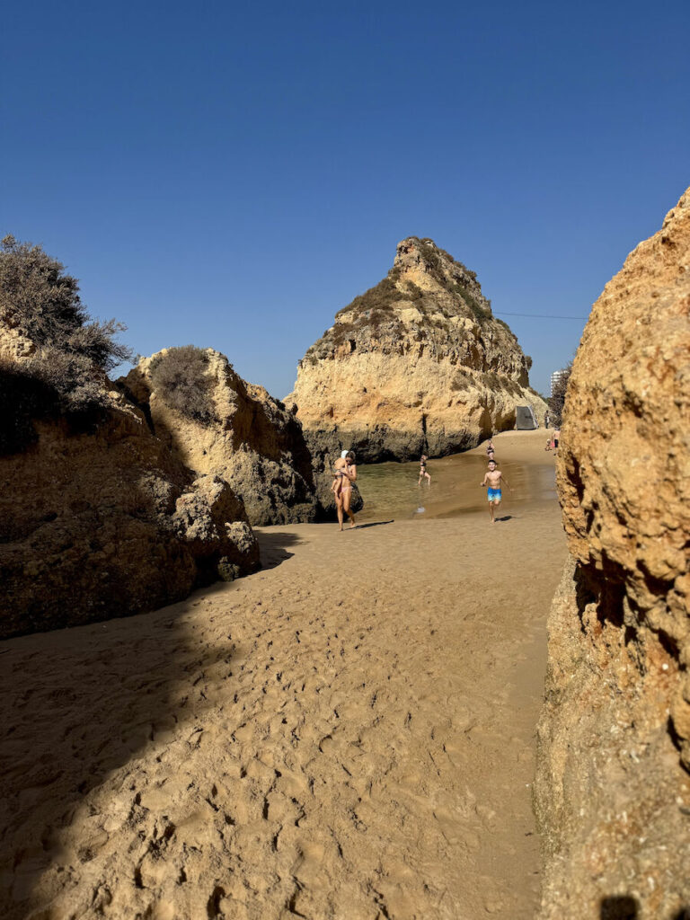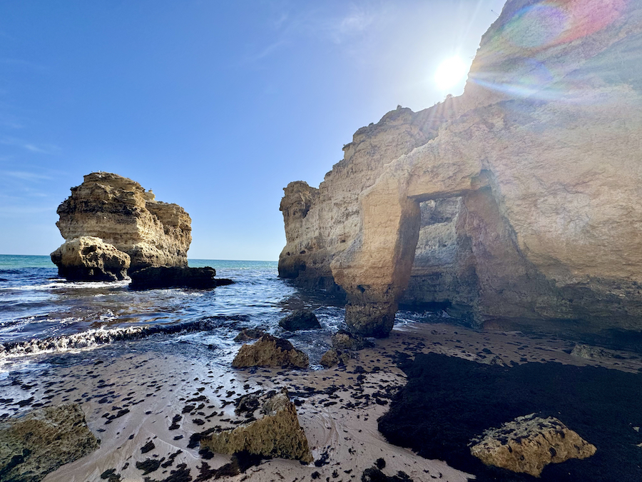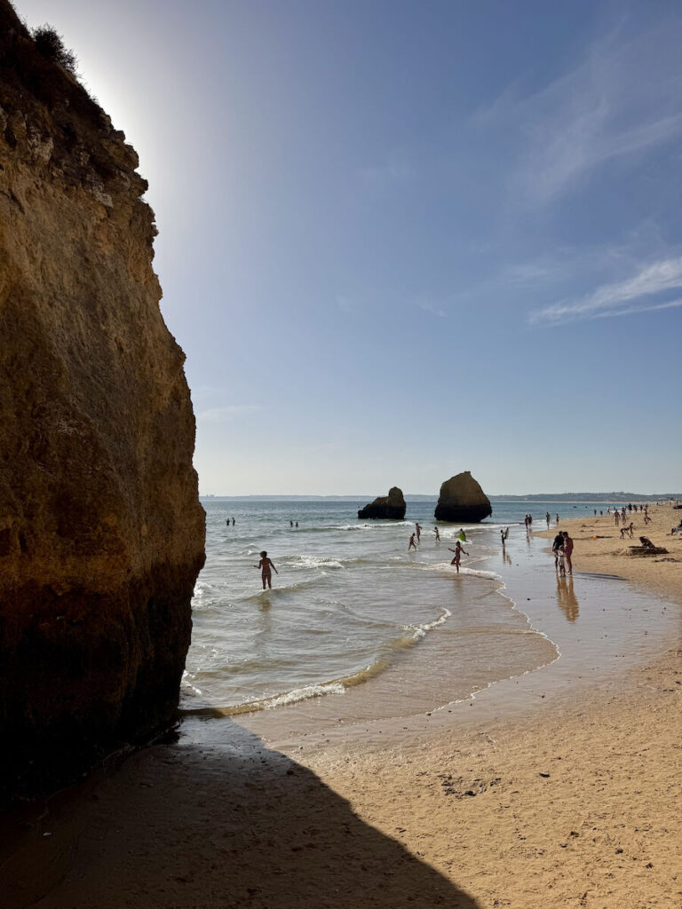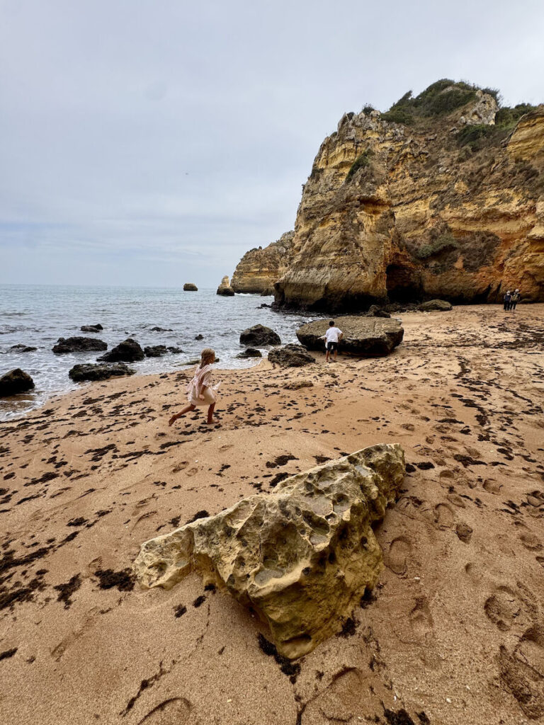 Schodíkmi sme zostúpili na pláž Praia da Rocha a zamierili k veľkej skale, cez ktorú viedol tunel na Praia dos Três Castelos. Tam sme strávili celý deň potulkami a skúmaním skalnatých častí či behaním po mori.