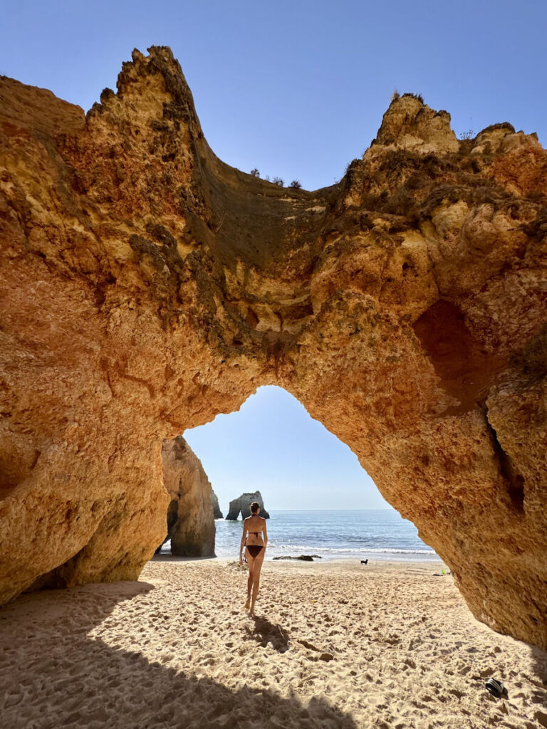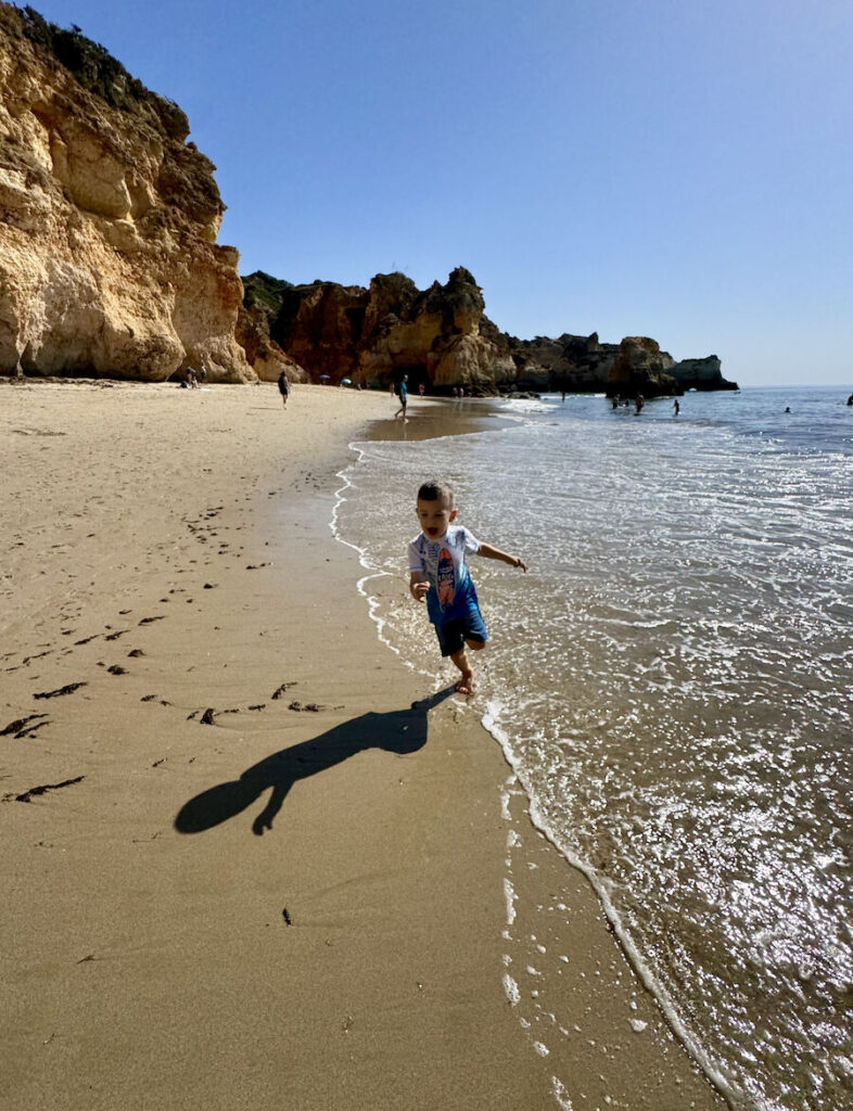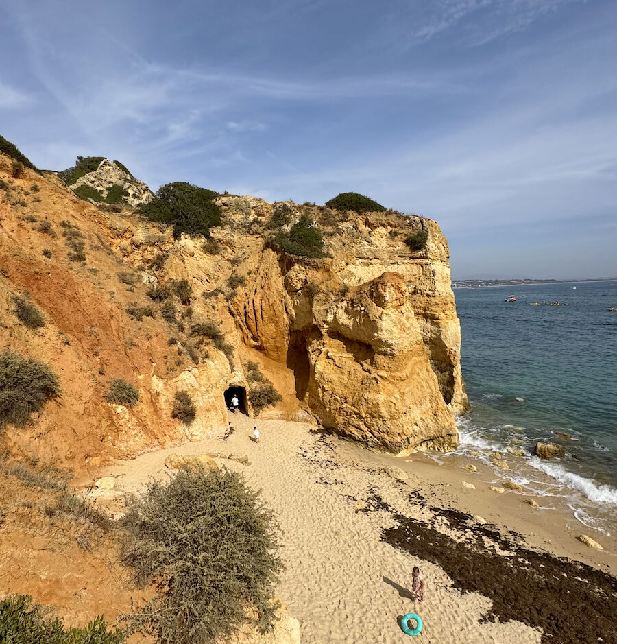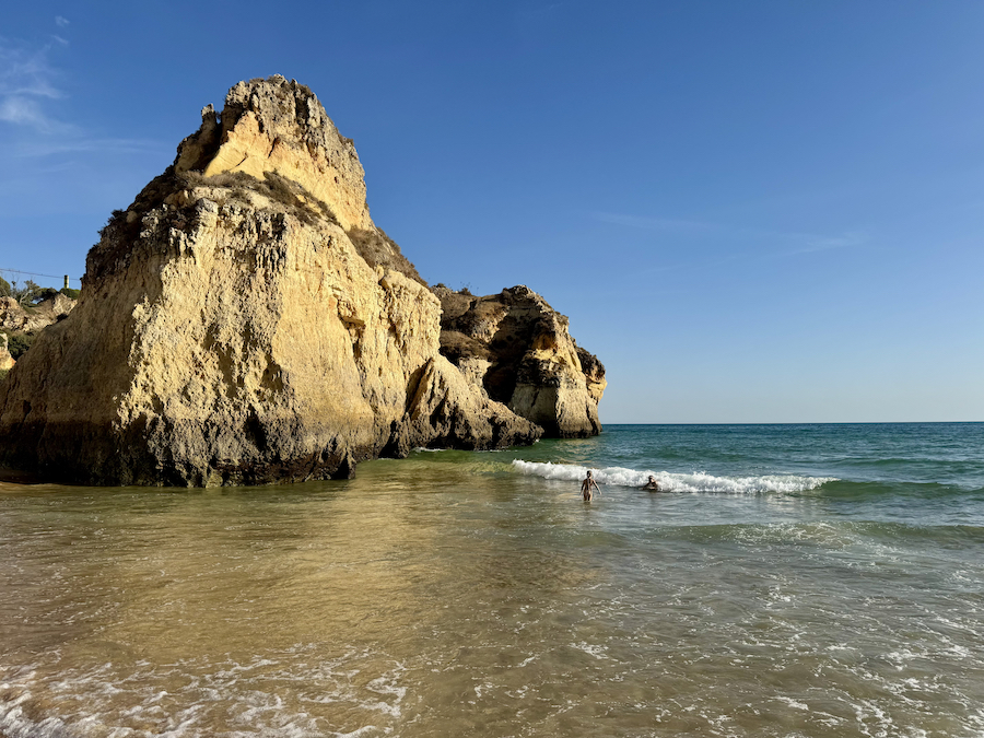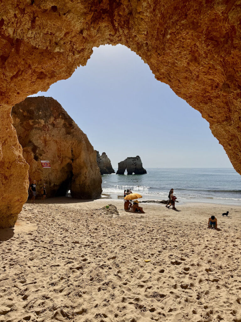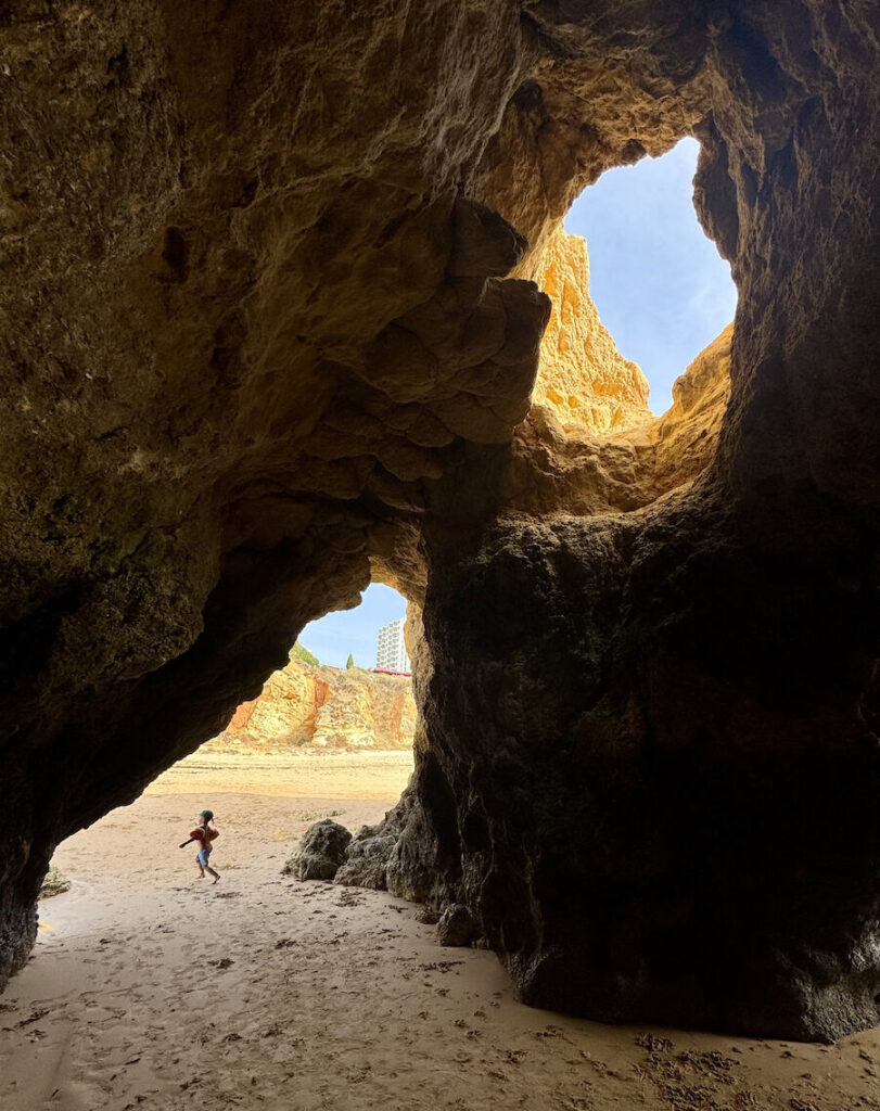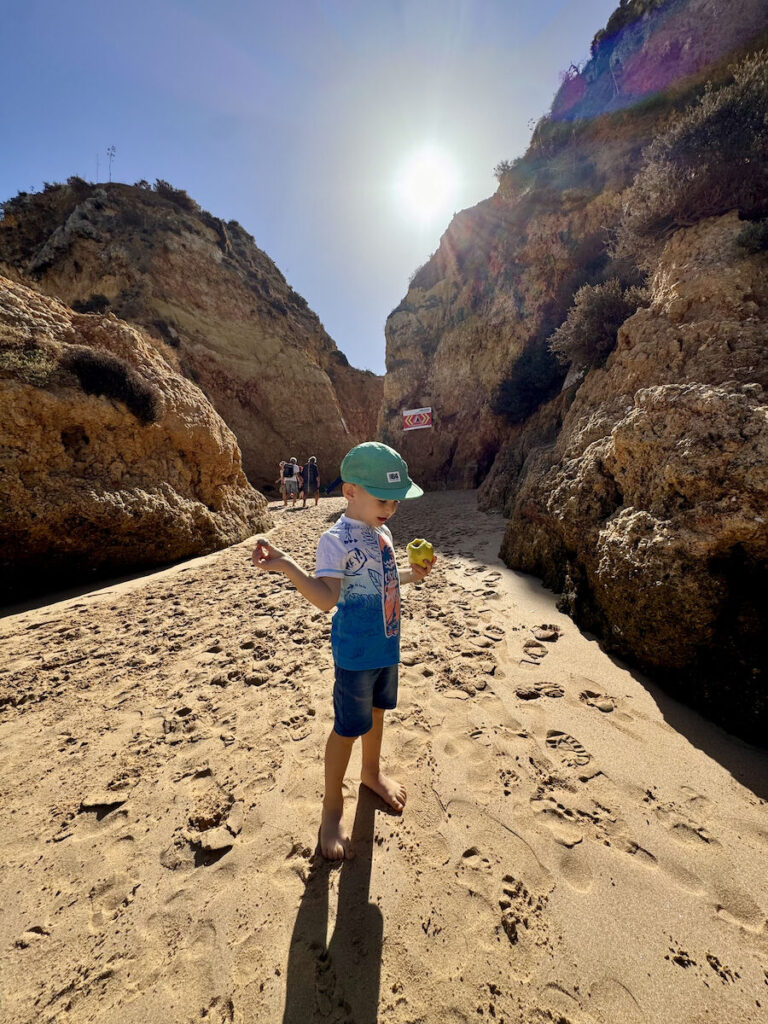 Schodíkmi sme zostúpili na pláž Praia da Rocha a zamierili k veľkej skale, cez ktorú viedol tunel na Praia dos Três Castelos. Tam sme strávili celý deň potulkami a skúmaním skalnatých častí či behaním po mori.
