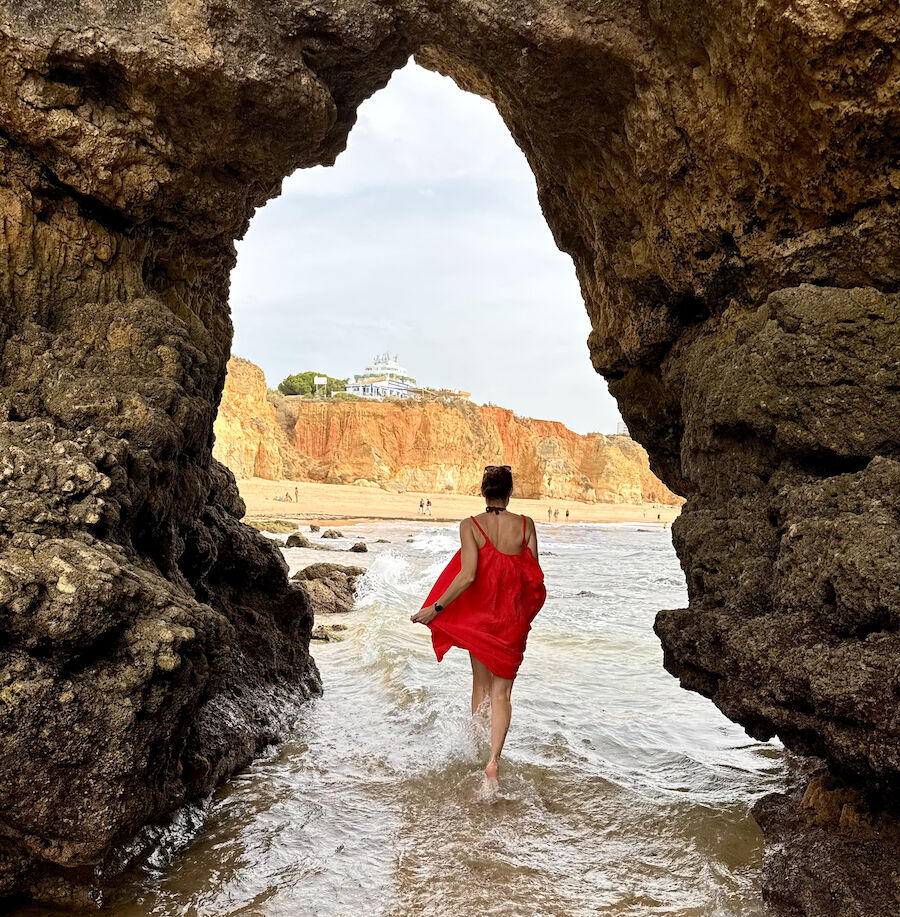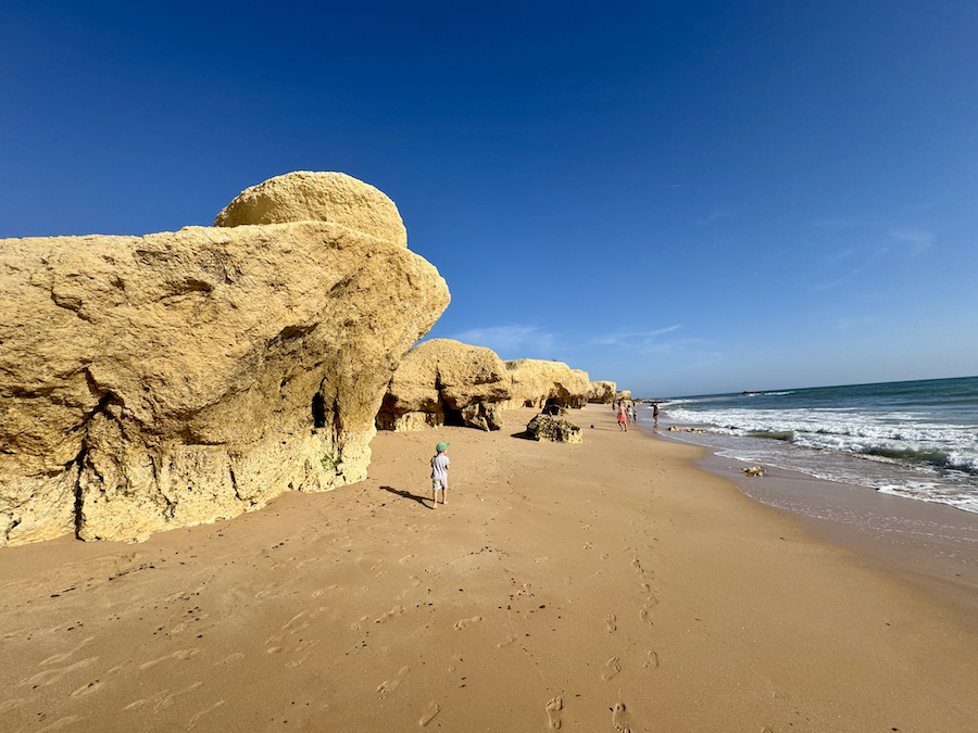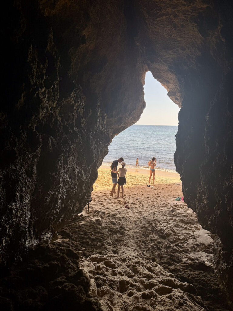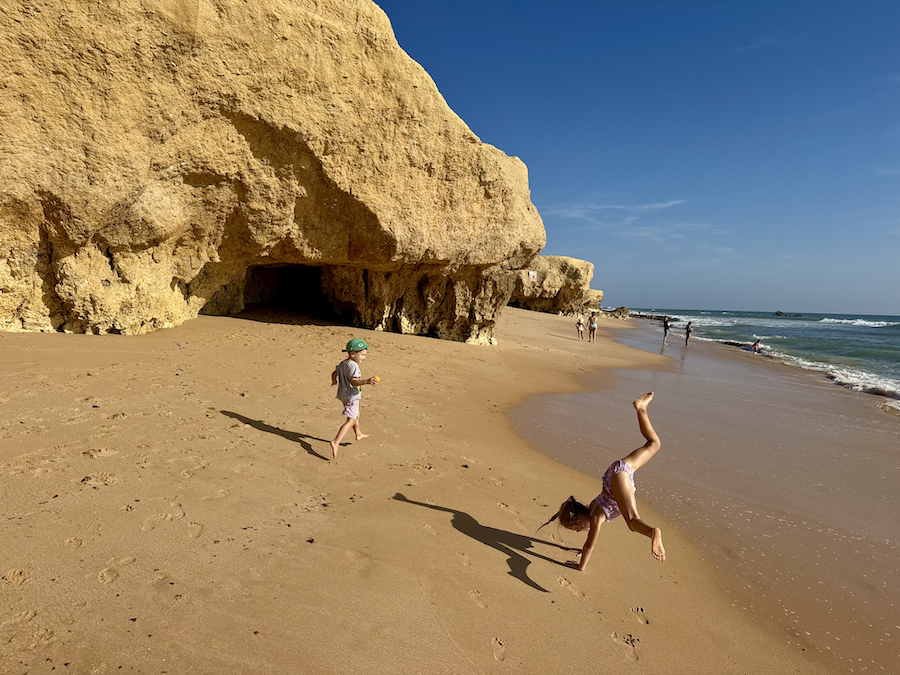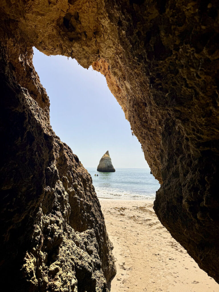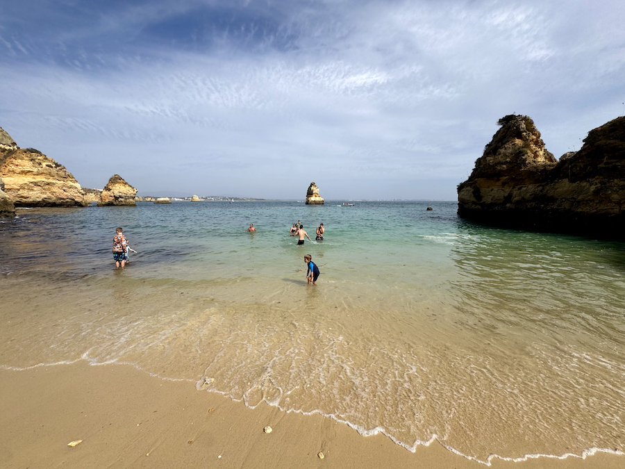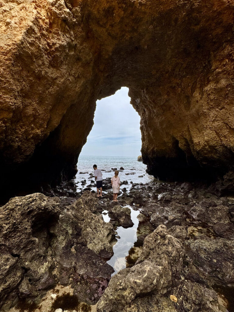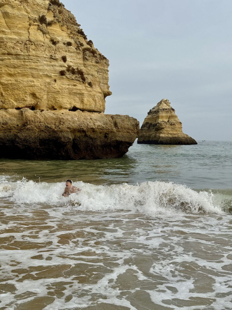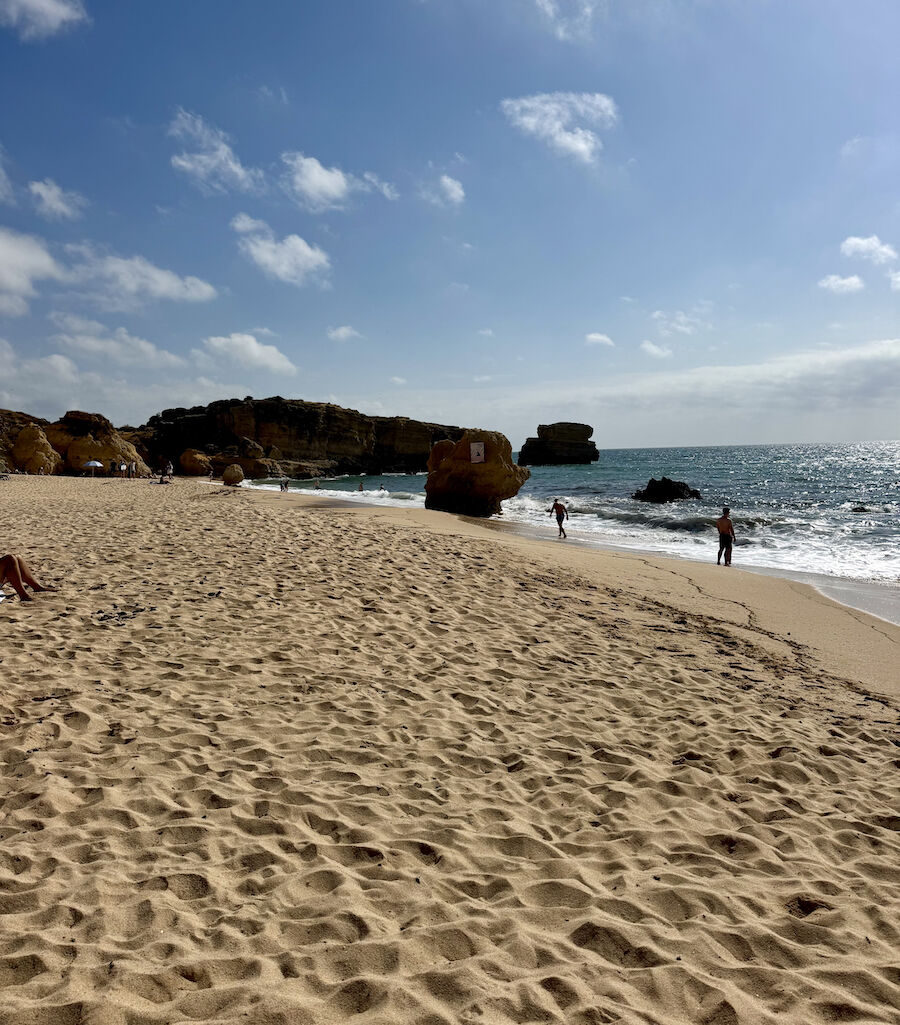Schodíkmi sme zostúpili na pláž Praia da Rocha a zamierili k veľkej skale, cez ktorú viedol tunel na Praia dos Três Castelos. Tam sme strávili celý deň potulkami a skúmaním skalnatých častí či behaním po mori.
