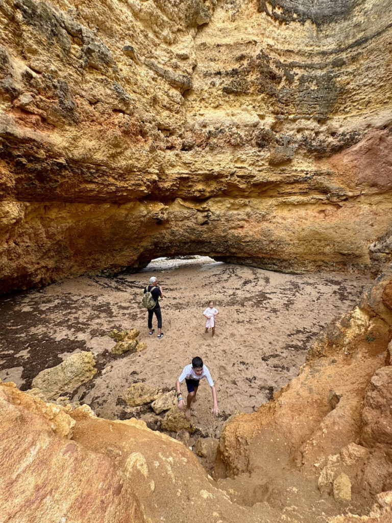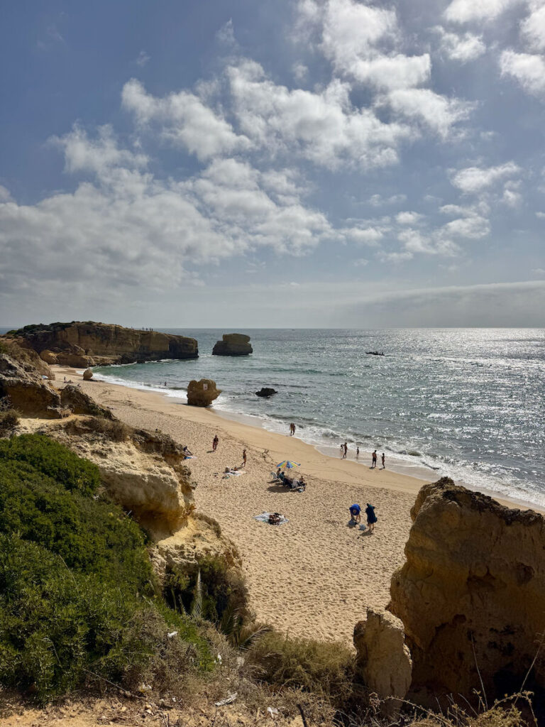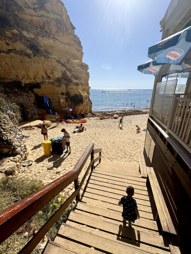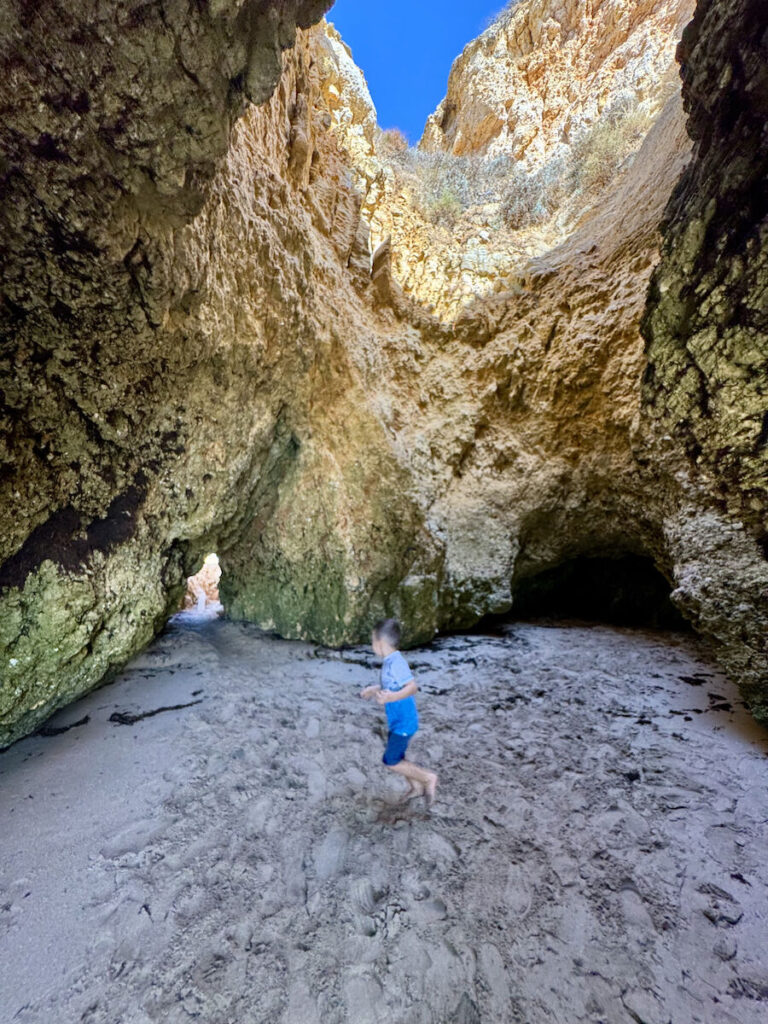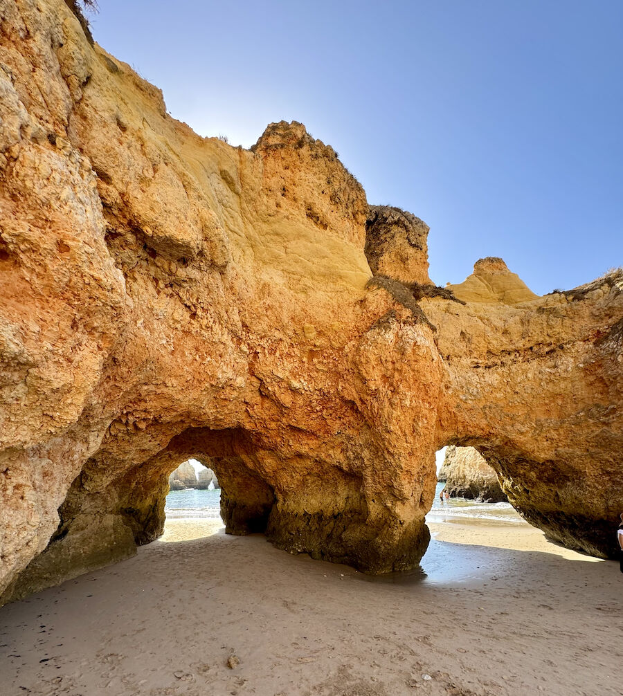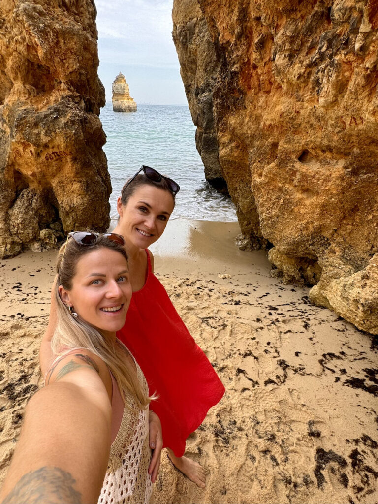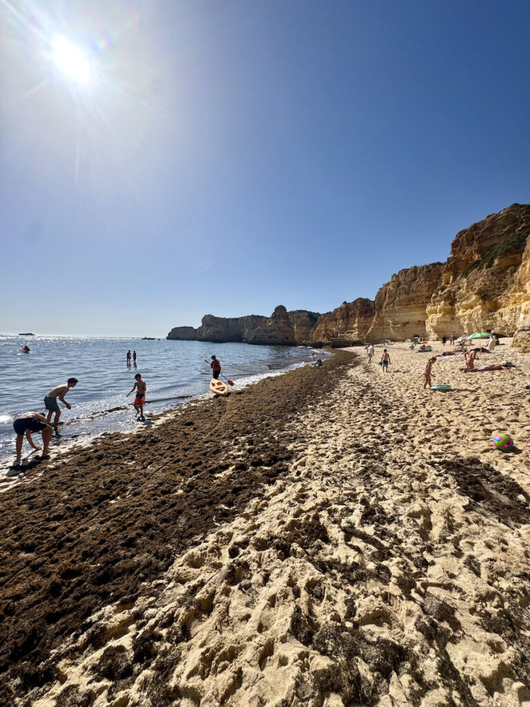 Schodíkmi sme zostúpili na pláž Praia da Rocha a zamierili k veľkej skale, cez ktorú viedol tunel na Praia dos Três Castelos. Tam sme strávili celý deň potulkami a skúmaním skalnatých častí či behaním po mori.