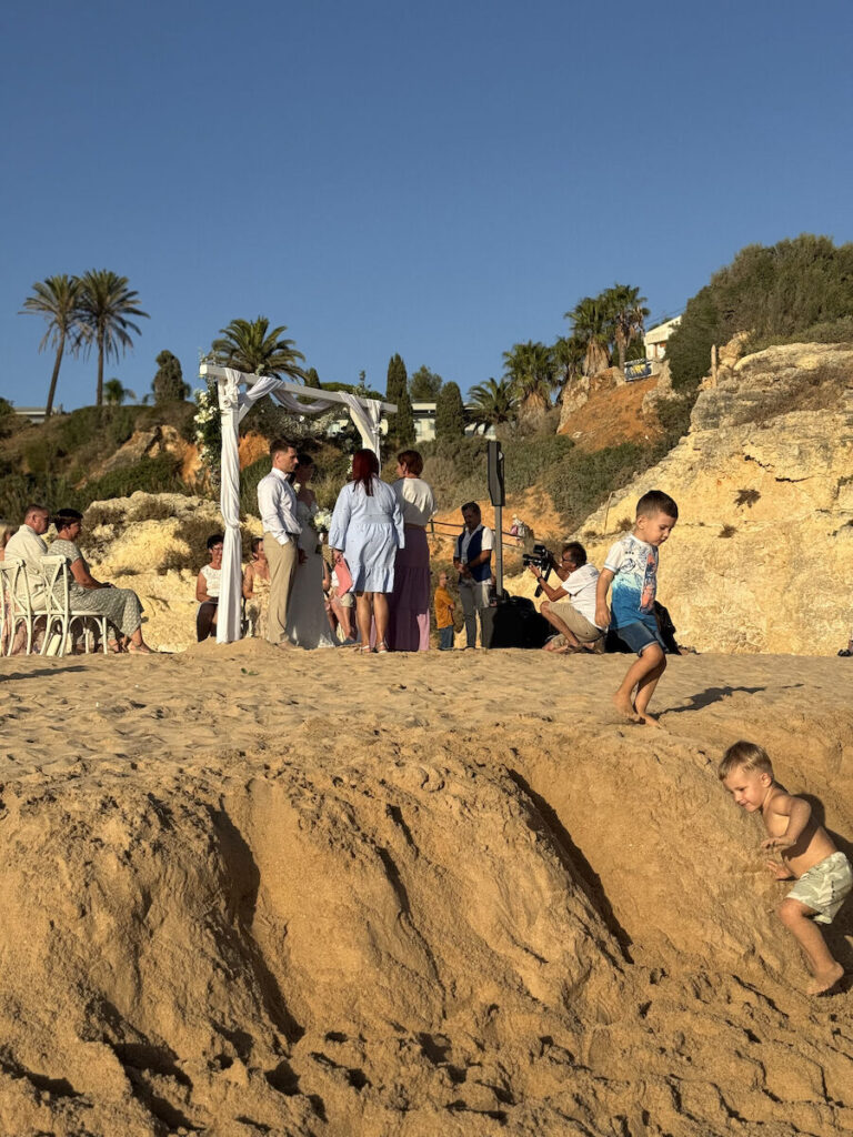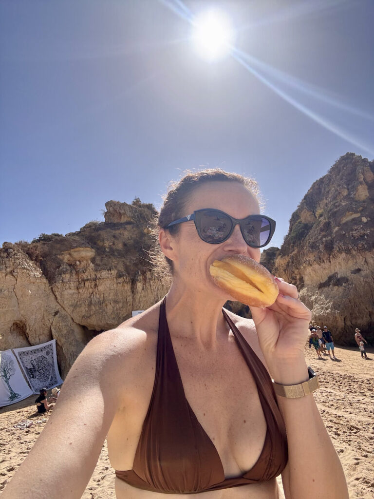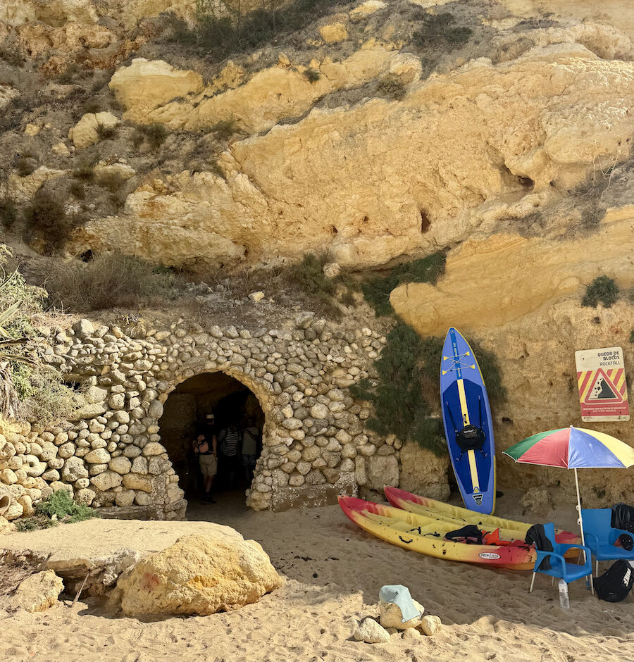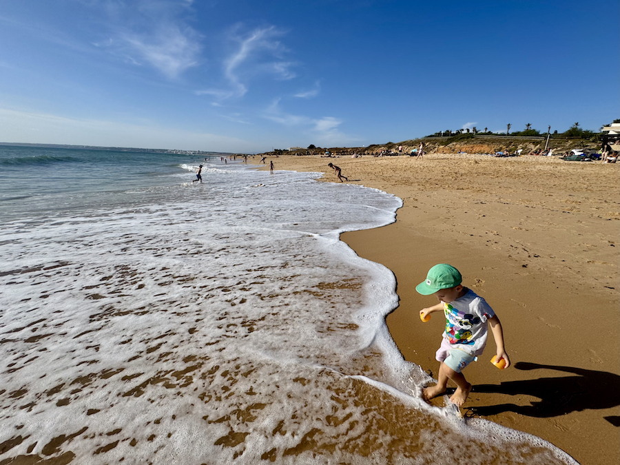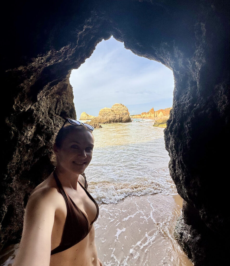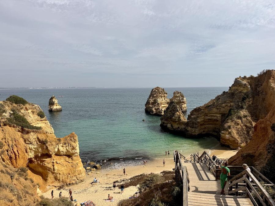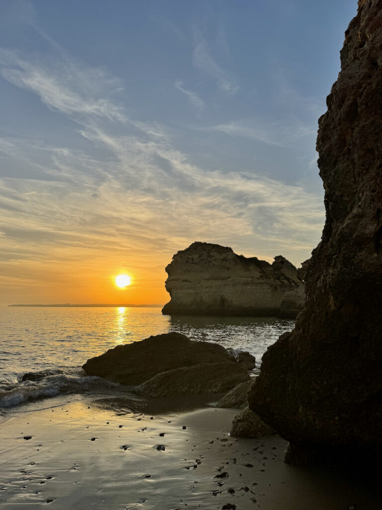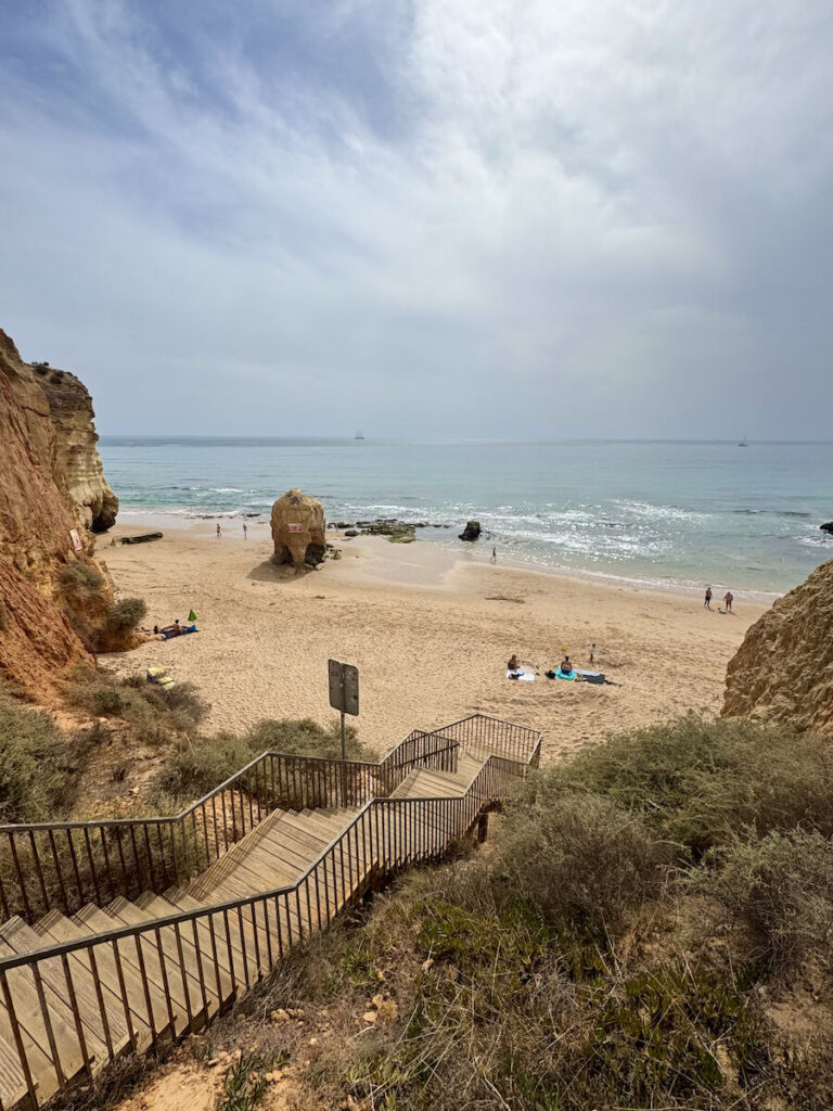 Schodíkmi sme zostúpili na pláž Praia da Rocha a zamierili k veľkej skale, cez ktorú viedol tunel na Praia dos Três Castelos. Tam sme strávili celý deň potulkami a skúmaním skalnatých častí či behaním po mori.
