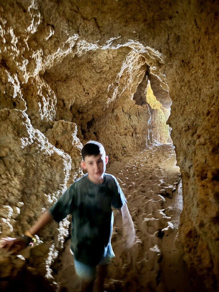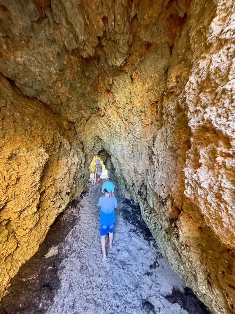 V ľavej časti môžete prejsť cez tunel v skale na „Tajnú pláž“ – Secret beach. Až taká tajná síce nie je, bolo na nej viacero ľudí. :) Prechod je však náročnejší, treba preliezť cez skaly v tuneli, menším deťom treba pomôcť – zdvihnúť ich a spustiť ich do piesku, s pomocou to však zvládnete. Ako menšie dobrodružstvo to bolo super.