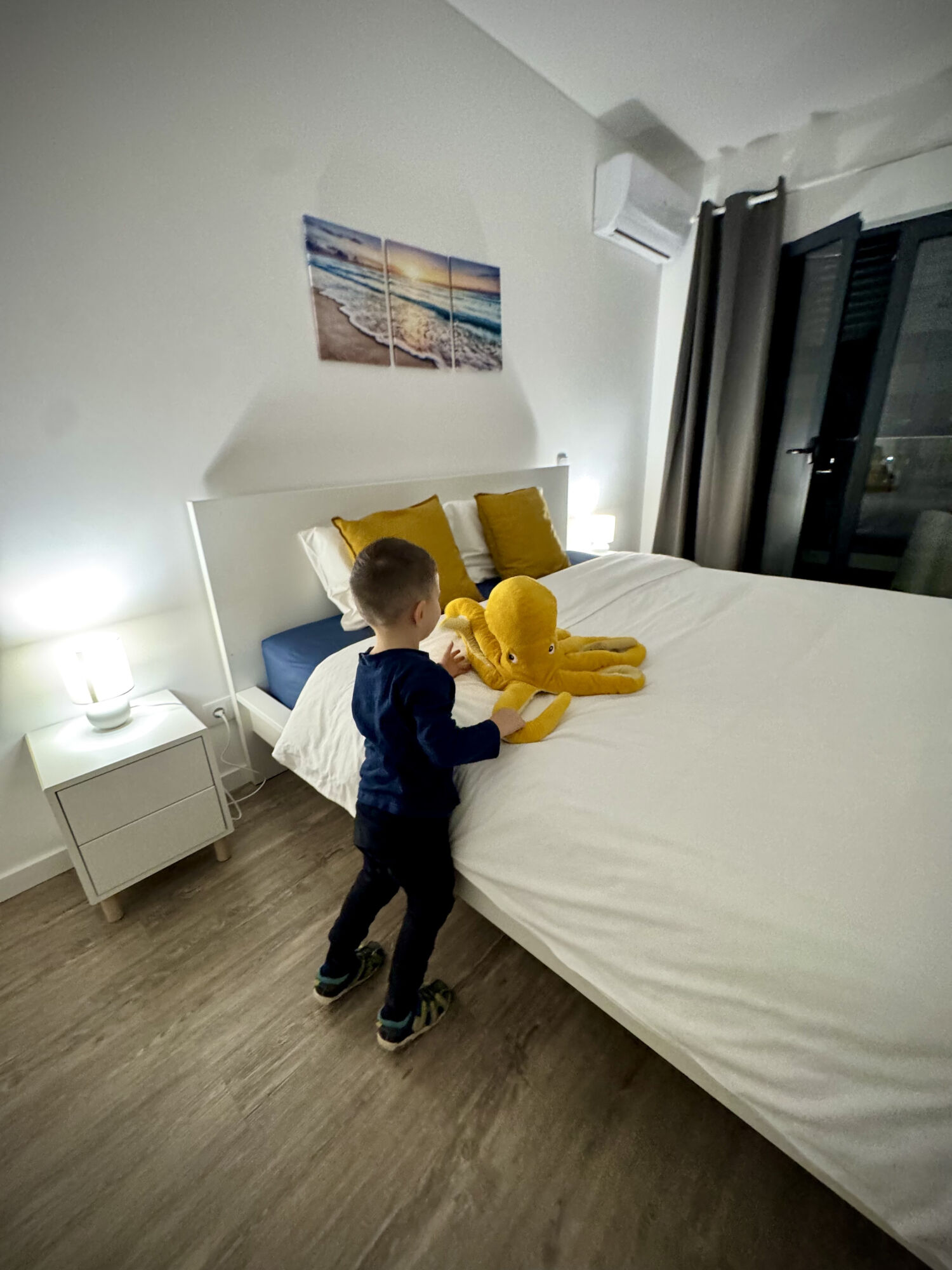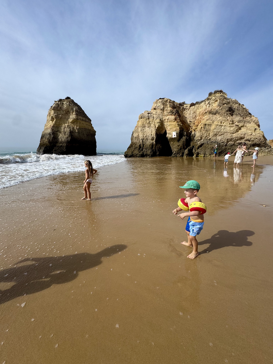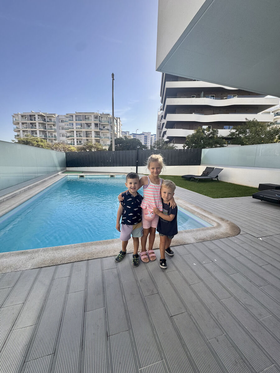 My sme si vybrali mesto Portimão a pláže Praia Dos Tres Irmaos so susednou Prainha sa stali našimi najobľúbenejšími – viď popis nižšie. S kamarátkou sme cez Airbnb rezervovali krásny moderný apartmán s 2 spálňami, 2 kúpeľňami, spojenou kuchyňou s obývačkou a jedálenskou časťou a veľkou terasou. Pod apartmánovým domom bol k dispozícii bazén (nevyhrievaný), deti sa v ňom párkrát okúpali. Parkovanie je na ulici pred apartmánom, alebo pár krokov ďalej na hlinenom parkovisku zdarma – tam bolo stále voľné miesto. Majiteľ nám pripravil na privítanie fľašu vína, džúsy a snacky – potešilo. :) Komunikácia s ním bola perfektná, iniciatívne sa pýtal, či niečo nepotrebujeme a veľmi rýchlo odpovedal na všetky otázky cez správy v appke Airbnb. K najbližšiemu veľkému supermarketu či pláži to bolo pár minút autom.