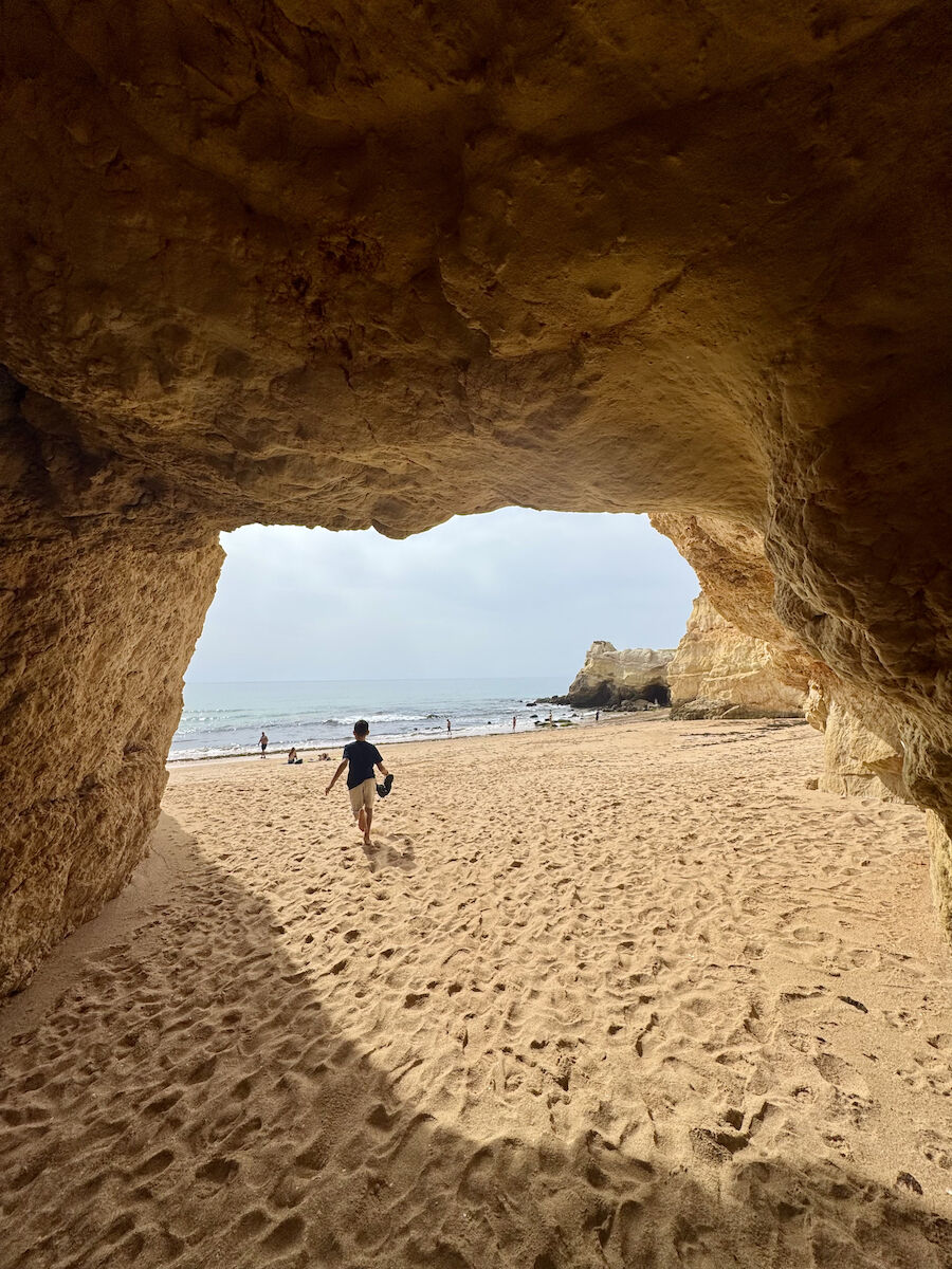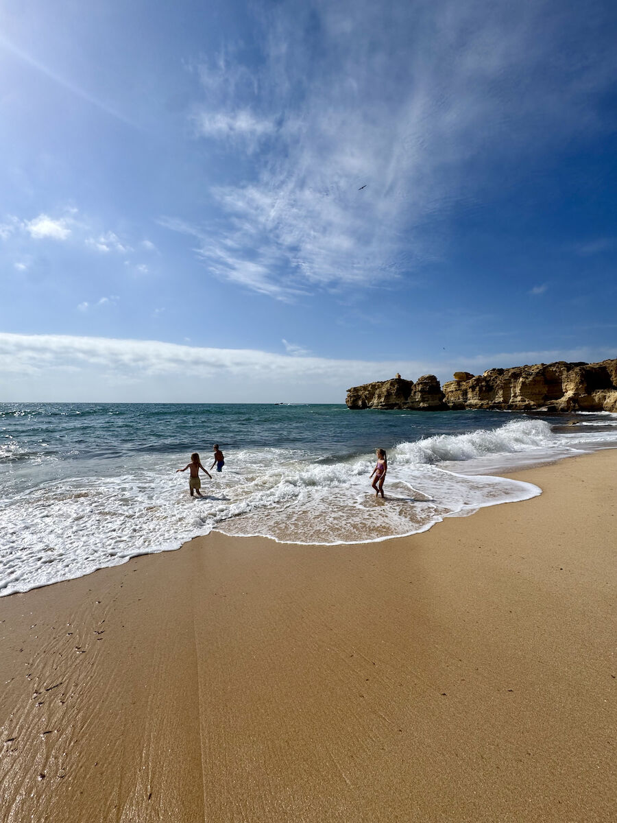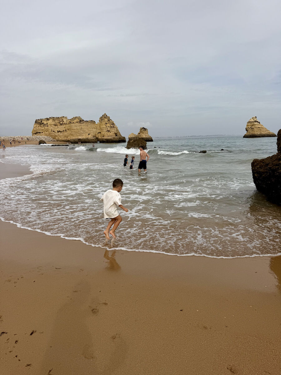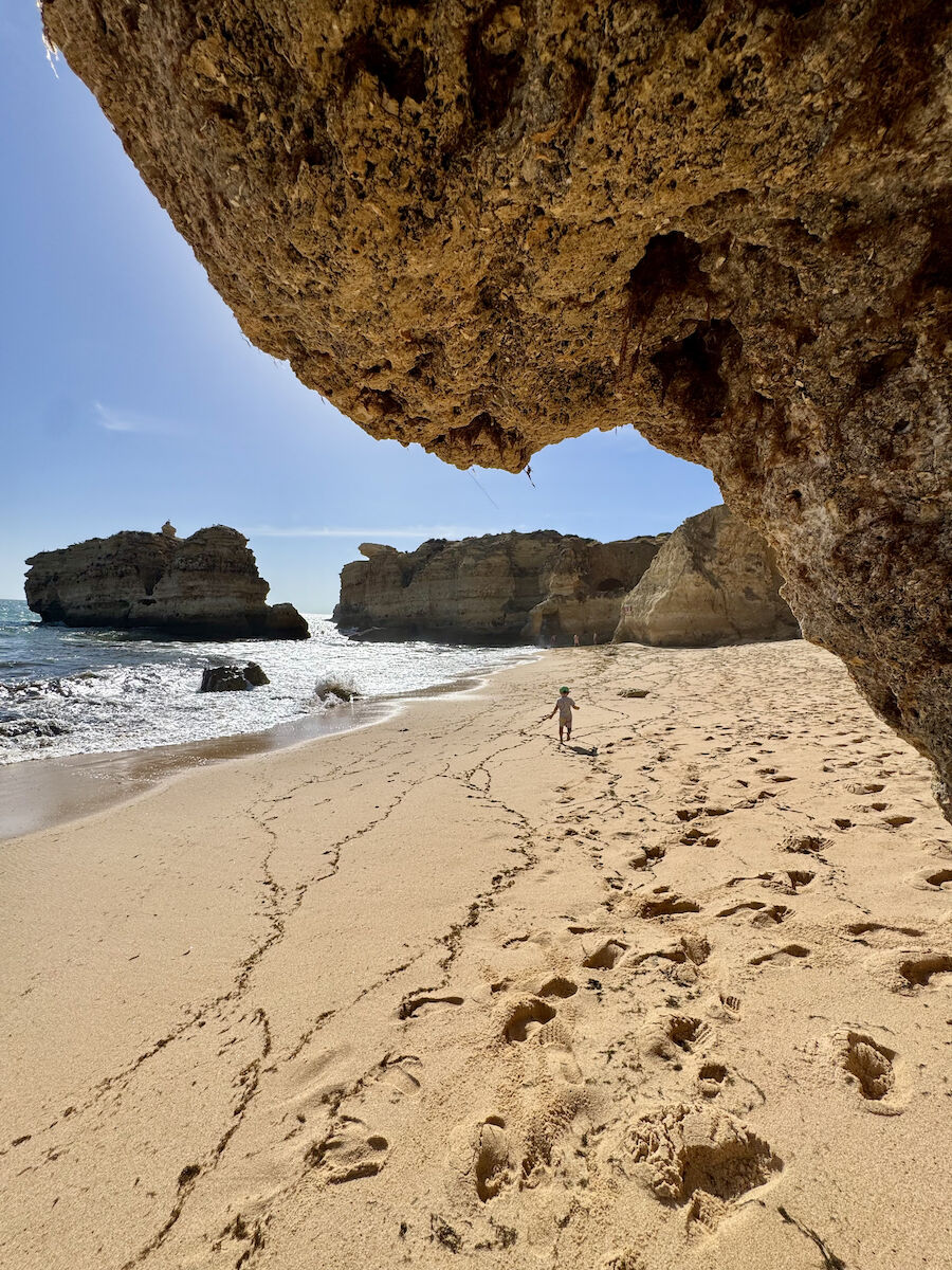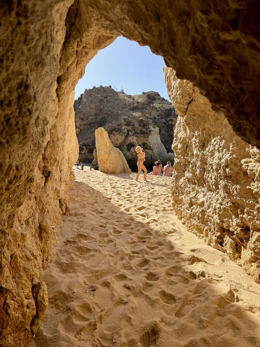Schodíkmi sme zostúpili na pláž Praia da Rocha a zamierili k veľkej skale, cez ktorú viedol tunel na Praia dos Três Castelos. Tam sme strávili celý deň potulkami a skúmaním skalnatých častí či behaním po mori.