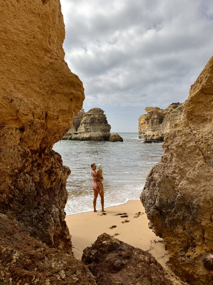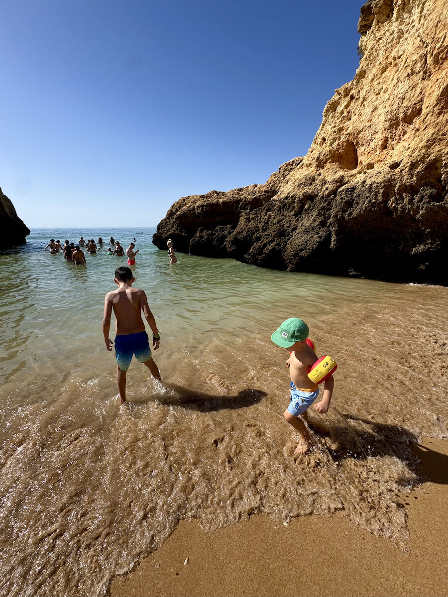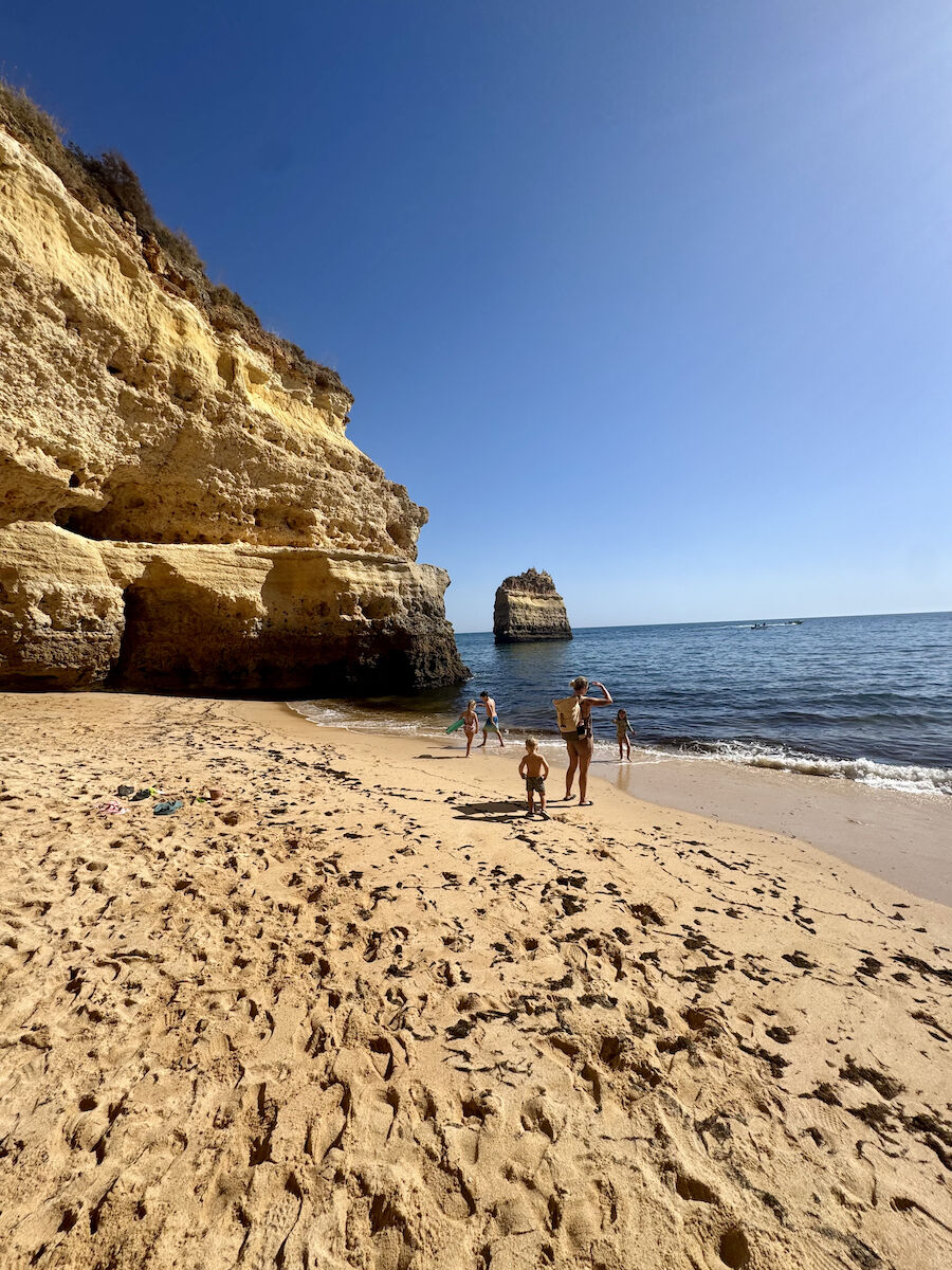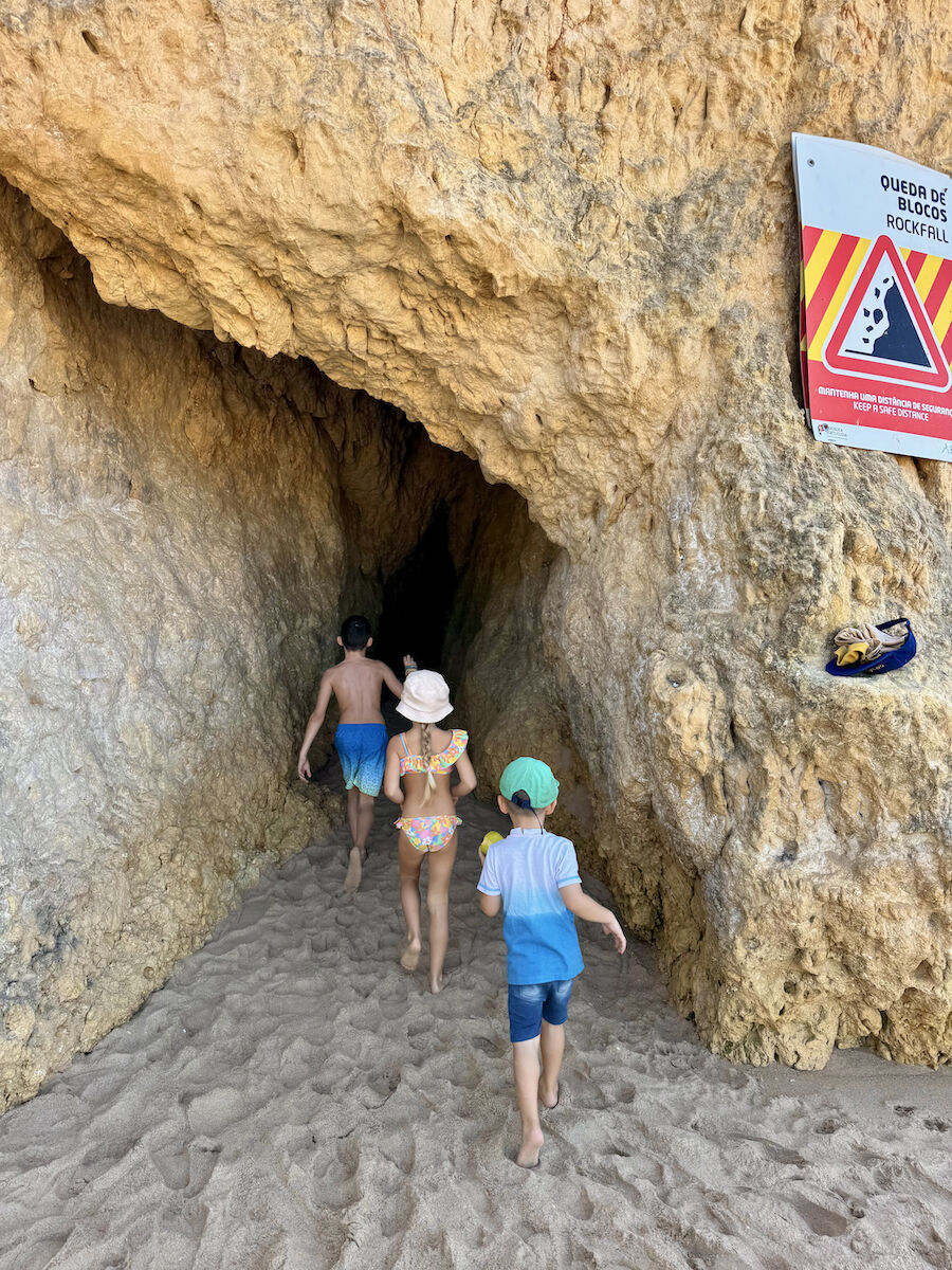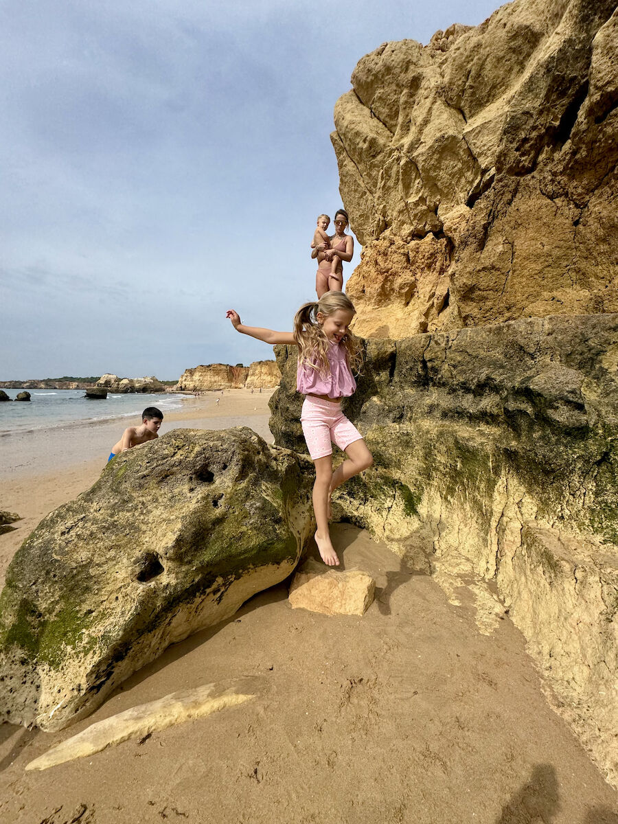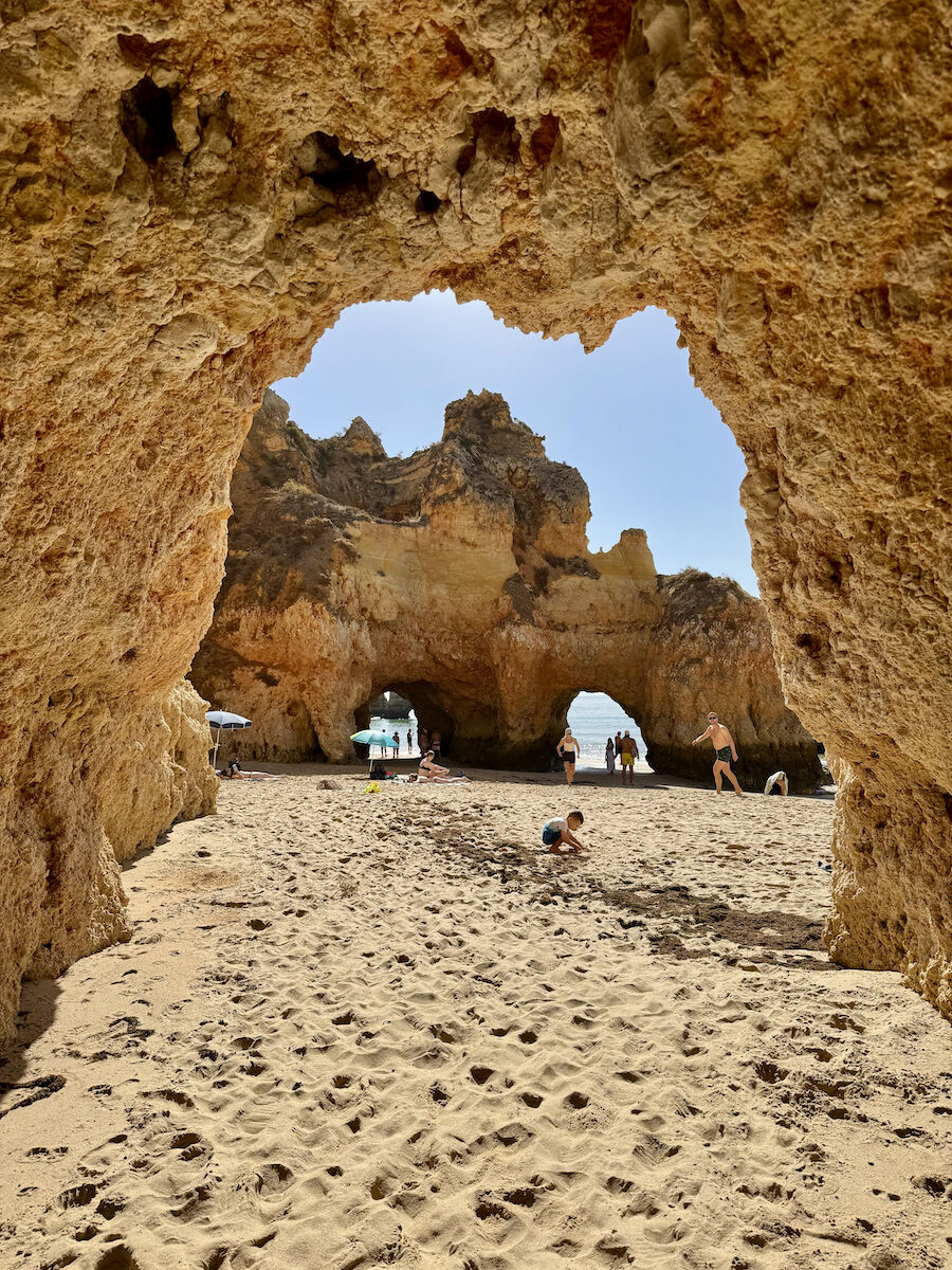 Schodíkmi sme zostúpili na pláž Praia da Rocha a zamierili k veľkej skale, cez ktorú viedol tunel na Praia dos Três Castelos. Tam sme strávili celý deň potulkami a skúmaním skalnatých častí či behaním po mori.