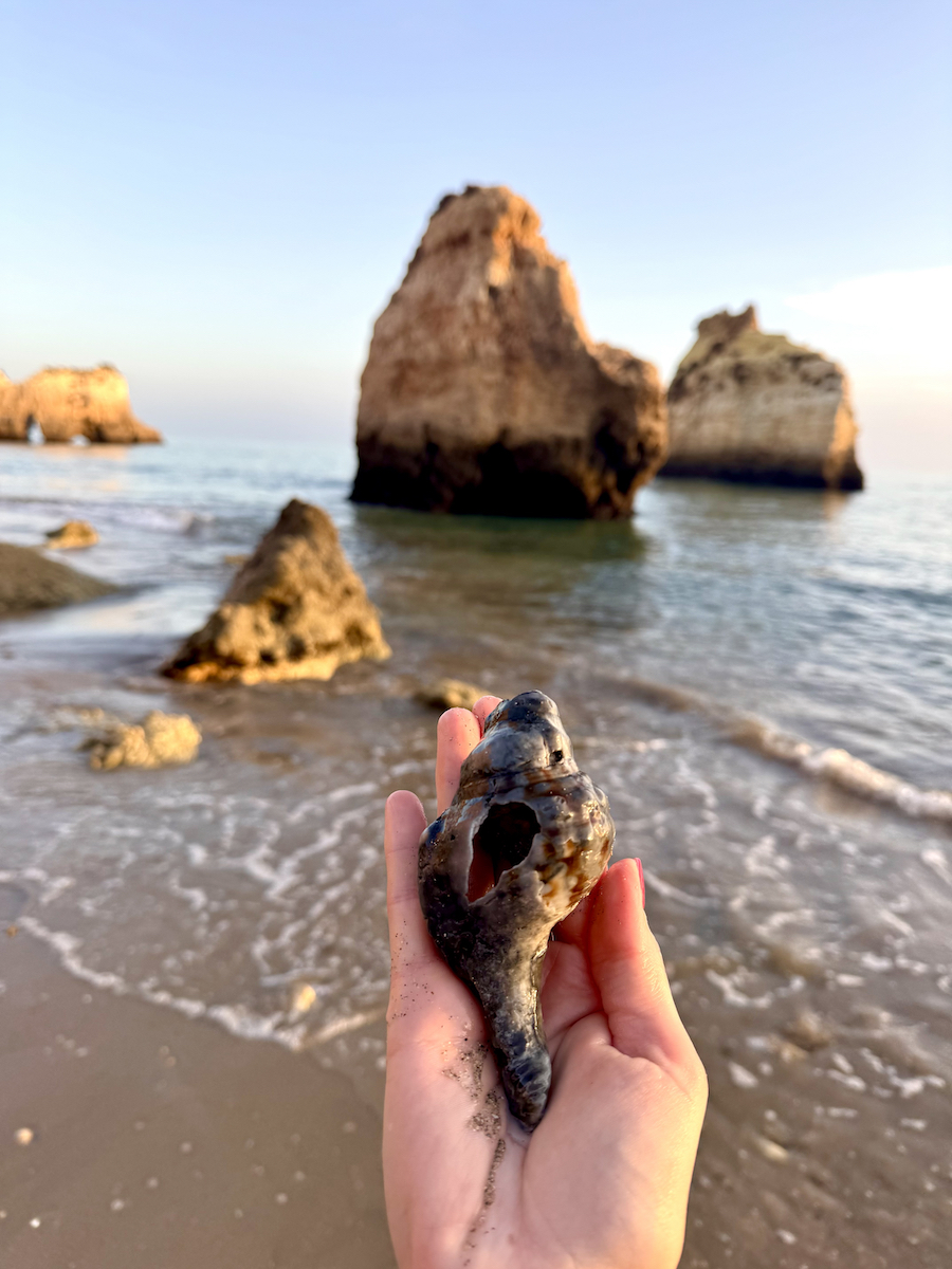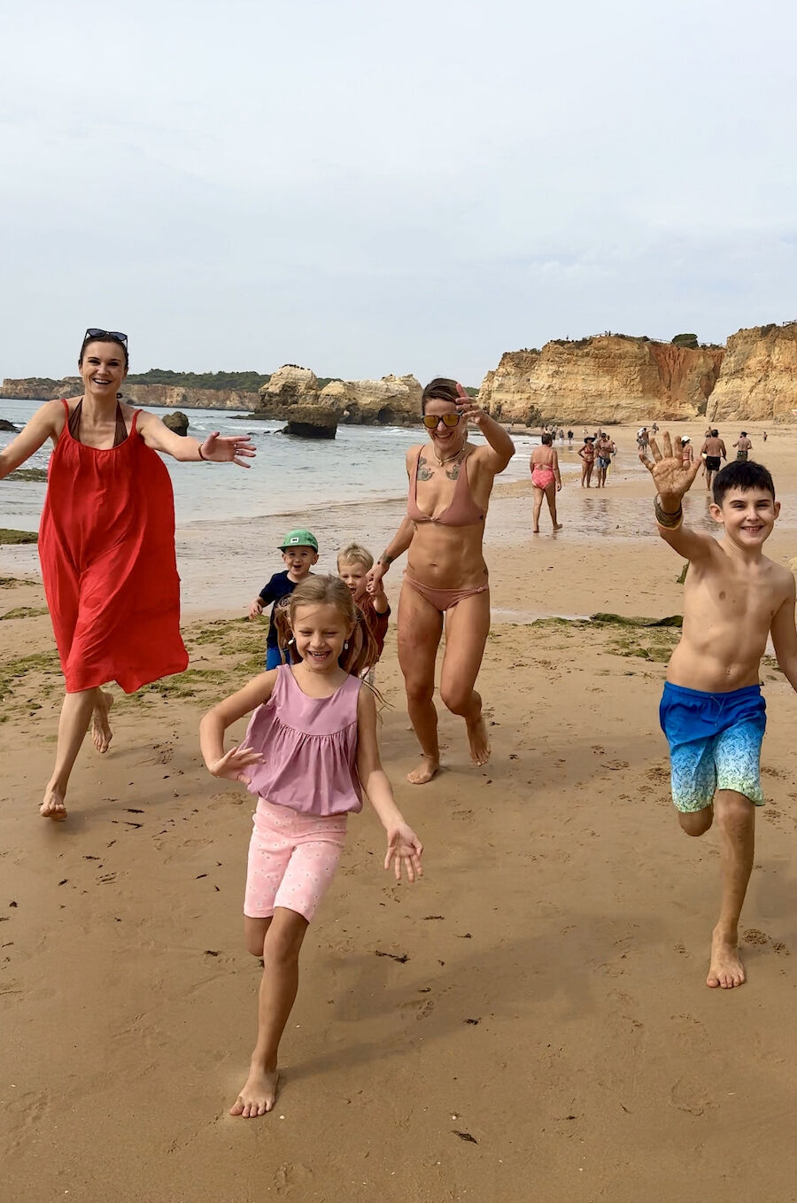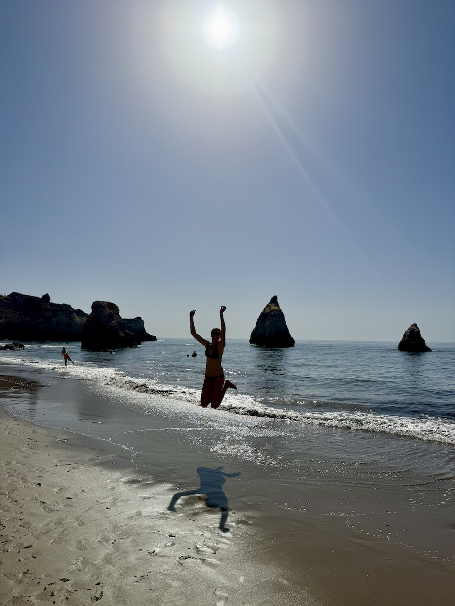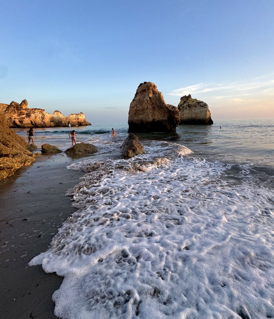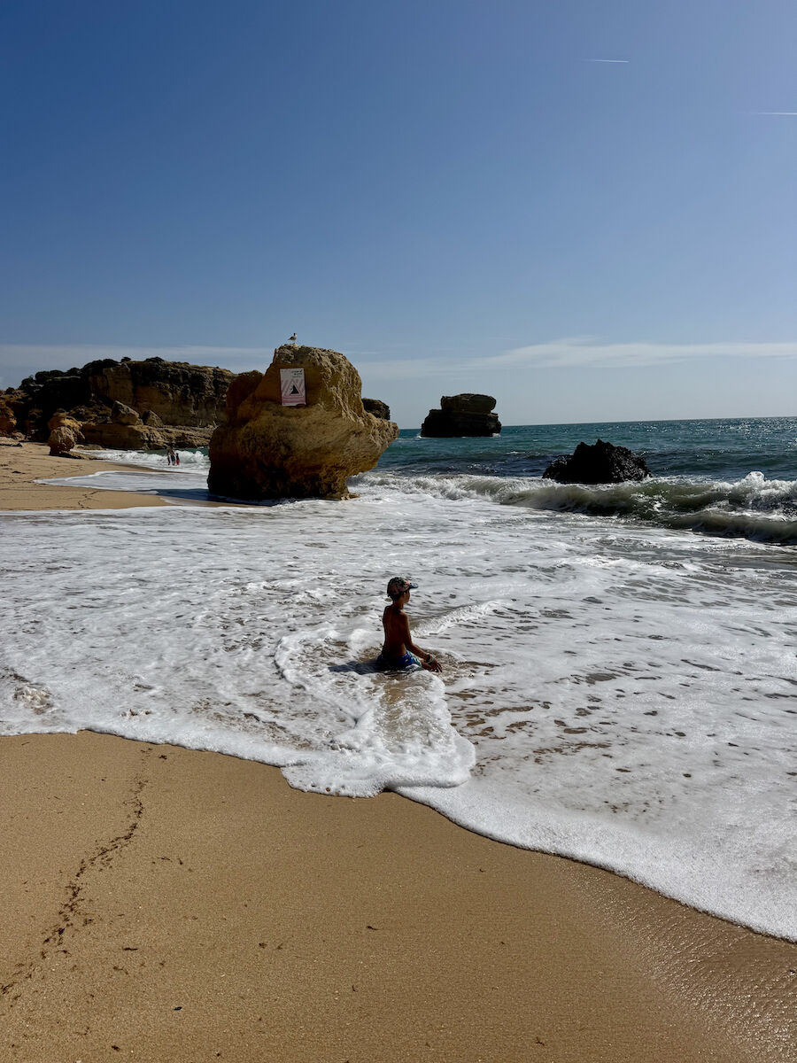 Schodíkmi sme zostúpili na pláž Praia da Rocha a zamierili k veľkej skale, cez ktorú viedol tunel na Praia dos Três Castelos. Tam sme strávili celý deň potulkami a skúmaním skalnatých častí či behaním po mori.