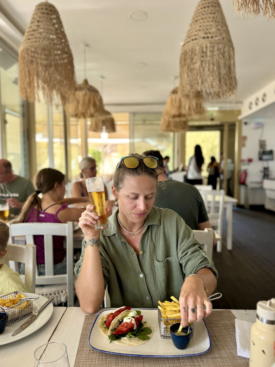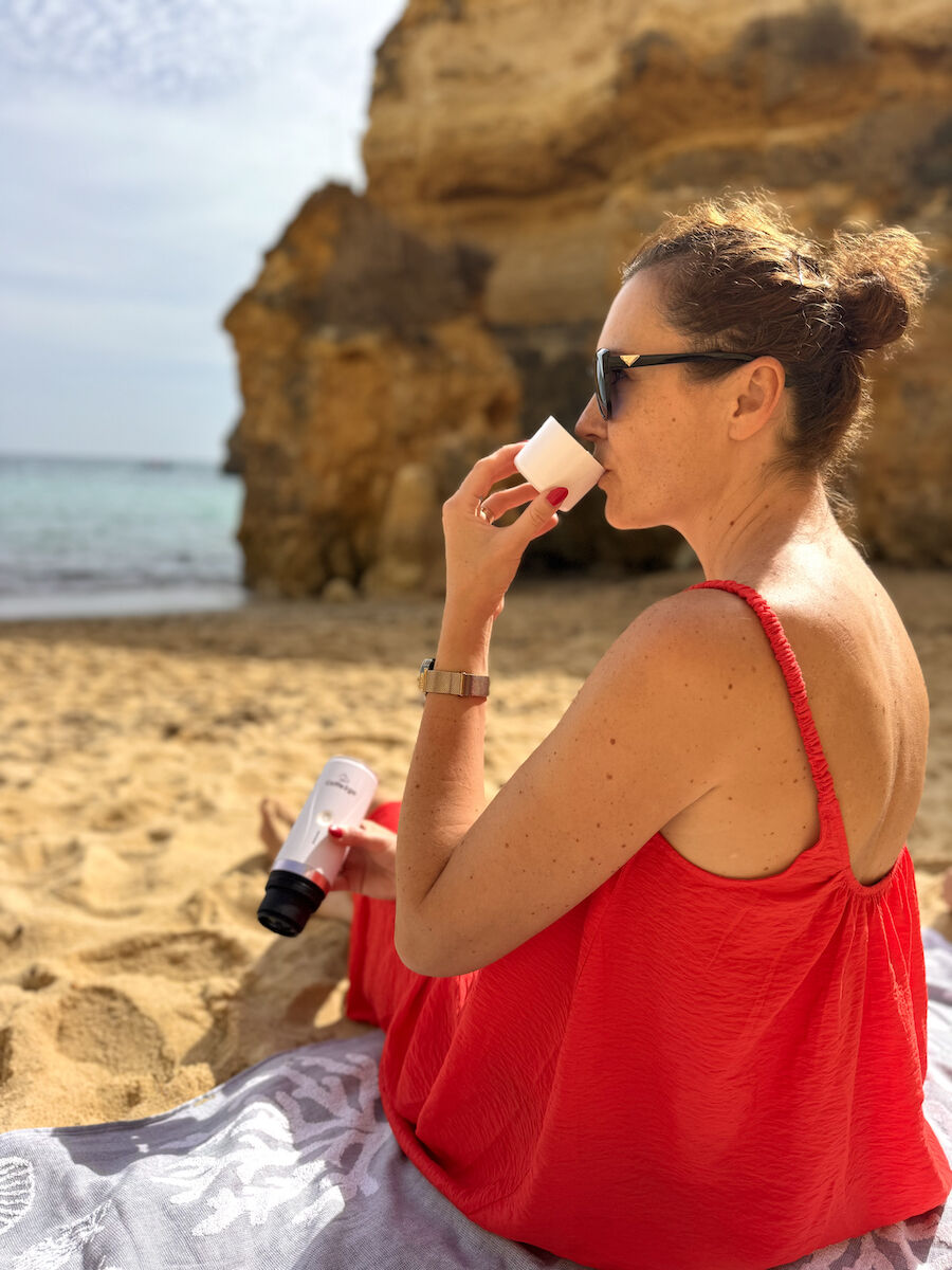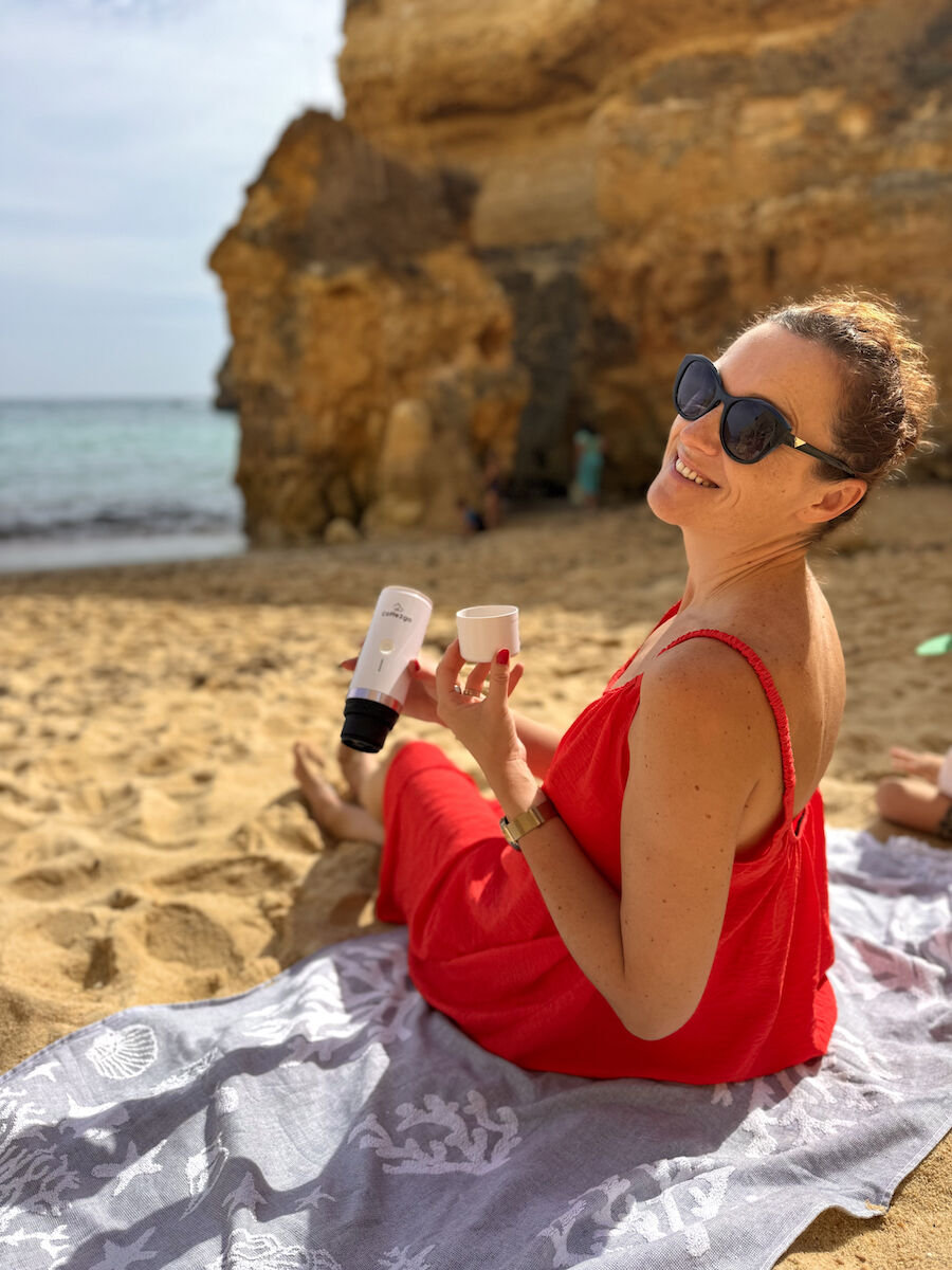Na tejto aj ostatných plážach sme si robili svoje kávičky z kávy, čo som si doniesla z domu – istota dobrej chuti. :) Kávovar, ktorý nosím už vyše roka na pláže, do prírody a na apartmány je odtiaľto >>. Je na kapsuly aj mletú kávu a robí super espresso s krásnou penou (nezabudnite mletú kávu poriadne utlačiť). Nabíja sa pomocou nabíjačky rovnako ako mobil. S kódom BEZCESTOVKY10 ho máte so zľavou.