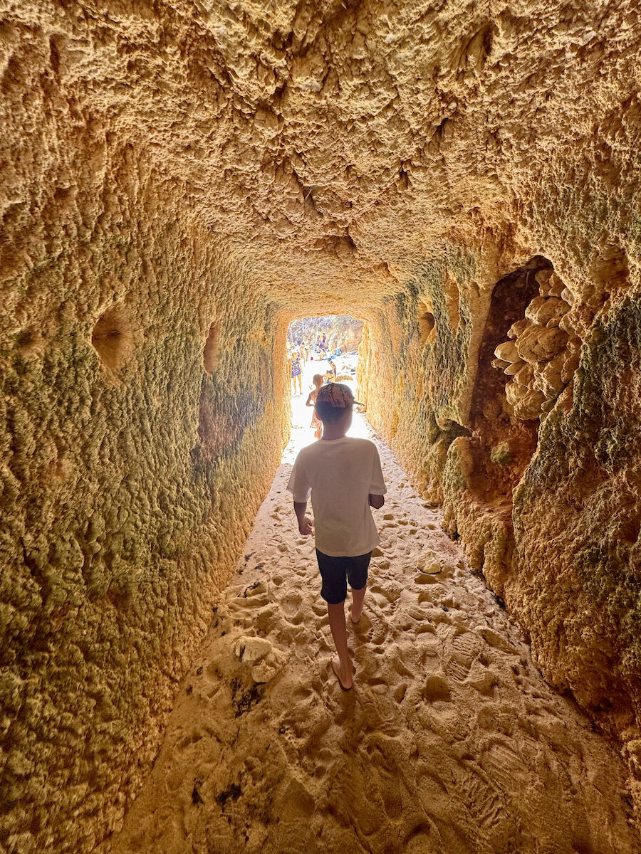 V ľavej časti môžete prejsť cez tunel v skale na „Tajnú pláž“ – Secret beach. Až taká tajná síce nie je, bolo na nej viacero ľudí. :) Prechod je však náročnejší, treba preliezť cez skaly v tuneli, menším deťom treba pomôcť – zdvihnúť ich a spustiť ich do piesku, s pomocou to však zvládnete. Ako menšie dobrodružstvo to bolo super.